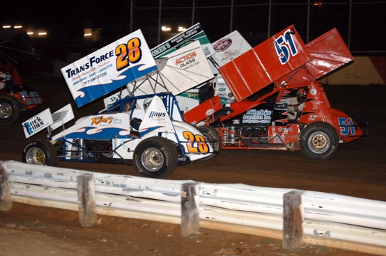 #031 - 410 Sprints. Hohn Rudasill (4) with a big push in traffic as Doug Esh